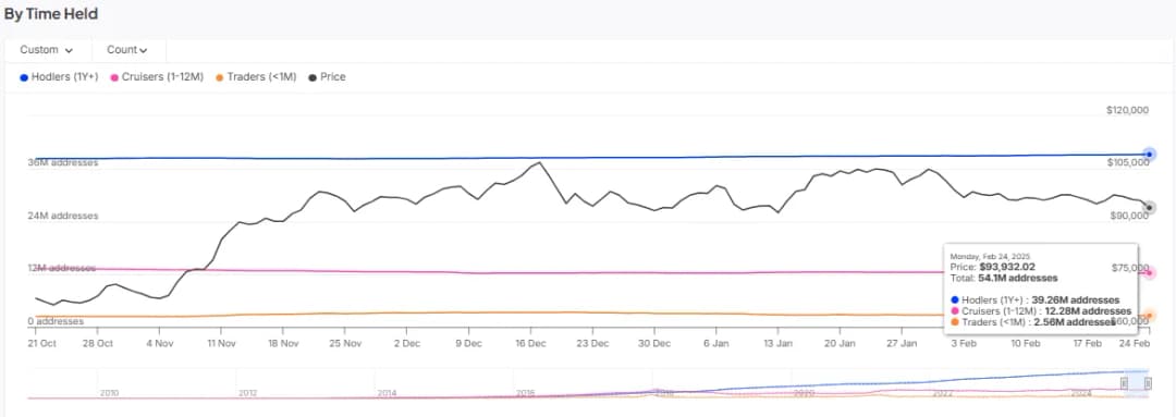 تعداد آدرسهایی که بیت کوین نگه میدارند در حال افزایش است. در حال حاضر، یک تغییر در حال وقوع است، به طوری که تعداد آدرسهای نگهدارنده (آدرسهایی که بیش از یک سال نگه داشتهاند) در حال افزایش است، در حالی که تعداد آدرسهای معاملهگر (کمتر از یک ماه) و آدرسهای میانمدت (۱-۱۲ ماه) در حال کاهش است. این بدان معناست که نگهدارندگان بلندمدت در حال افزایش هستند، عرضه را در بازار کاهش میدهند و از حرکات معاملاتی تکانشی جلوگیری میکنند. در زمان نگارش این مقاله، تعداد آدرسهای نگهدارنده به ۳۹.۲۶ میلیون رسیده است.