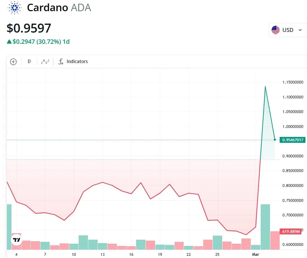 برخی از آلتکوینها پس از اخبار مثبت درباره پذیرش کریپتو در ایالات متحده، عملکرد بهتری نسبت به بازار گستردهتر ارزهای دیجیتال داشتند، در حالی که بیت کوین با جهشی قابل توجه به بالای سطح روانی ۹۰ هزار دلار بازگشت. توکن کاردانو (ADA) بیشترین افزایش را در بین ۱۰۰ ارز دیجیتال برتر داشت و در ۲۴ ساعت منتهی به ساعت ۱۰:۱۵ صبح به وقت هماهنگ جهانی در ۳ مارس بیش از ۴۳٪ افزایش یافت و بالای ۰.۹۵ دلار معامله شد، دادههای Cointelegraph Markets Pro نشان میدهد.