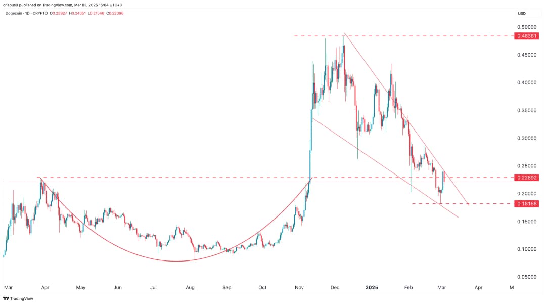 قیمت دوج کوین بیشتر سودهای سال ۲۰۲۴ را از دست داده و در ماههای اخیر بیش از ۵۰٪ کاهش یافته است. برای برخی سرمایهگذاران، این سقوط نشانهای برای ادامه فروش استقراضی است، در حالی که برخی کارشناسان خرید در این قیمت را توصیه میکنند. یک تحلیلگر کریپتو پیشبینی کرده که قیمت DOGE میتواند از ۰.۲۲۹۰ دلار به ۵ دلار افزایش یابد، زمانی که روند صعودی جدید بازار کریپتو آغاز شود.