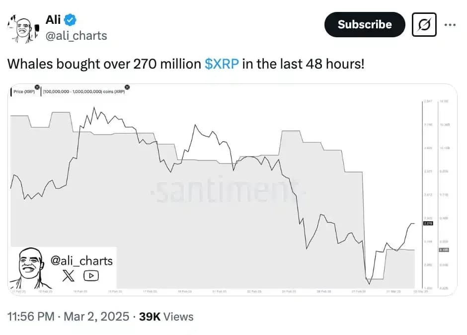 در همین حال، این اعلامیه تأثیر مثبتی بر قیمت XRP داشت که در ۲۴ ساعت گذشته ۱۷.۰۲٪ افزایش یافت و در زمان نگارش این مقاله به ۲.۶۵ دلار رسید. با این حال، تمام اعتبار این افزایش به هاسکینسون برنمیگردد، زیرا اعلامیه ترامپ دلیل اصلی سبز شدن بازار در ۲ مارس بود. این افزایش شدید همچنین با انباشت قابل توجه نهنگها همزمان شد، روندی که توسط تحلیلگر علی مارتینز برجسته شد.