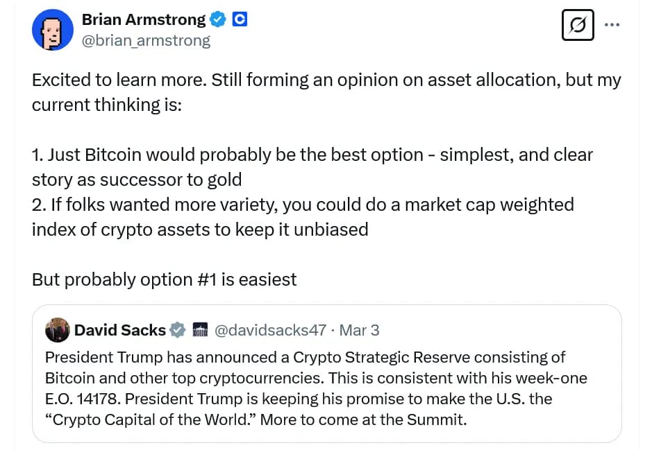 Brian Armstrong از Coinbase نیز موافق بود و گفت: «فقط بیت کوین احتمالاً بهترین گزینه خواهد بود» و به سادگی آن به عنوان یک رمزارز و جانشین واضح طلا اشاره کرد. اگر ایالات متحده به دنبال تنوع بیشتری باشد، Armstrong پیشنهاد کرد که از یک شاخص وزنی بر اساس ارزش بازار برای رمزارزها استفاده شود تا از بروز تعصب احتمالی جلوگیری شود.