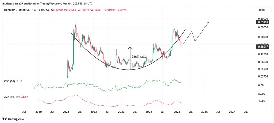 دوج کوین در حال عقبنشینی برای آزمایش مجدد این حمایت است، پس از اینکه فشار فروش در بازار گستردهتر قیمتها را کاهش داد. اگر بتواند این حمایت را حفظ کند، میتواند باعث افزایش ۲۶۶ درصدی قیمت به ۰.۶۵ دلار شود. در این نقطه، قیمت DOGE بیش از ۵ برابر قیمت فعلی خود افزایش یافته است.