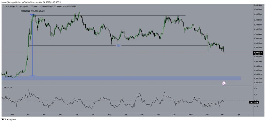 بازار میم کوینها همچنان با کاهشهای قابل توجهی مواجه است و Floki [FLOKI] پس از خروج از یک محدوده یکساله، به سمت سطح حمایت کلیدی $0.00002650 در حال حرکت است. این سطح قبلاً در مارس 2024 باعث افزایش 913.93 درصدی قیمت شده بود. قیمت فعلی $0.00007118 است که به طور قابل توجهی کمتر از آخرین اوج بزرگ آن است و به نظر میرسد در حال آزمایش ضعفهای ساختاری باشد. با توجه به روند نزولی مداوم، این منطقه میتواند به عنوان یک سطح تعیینکننده برای FLOKI عمل کند.