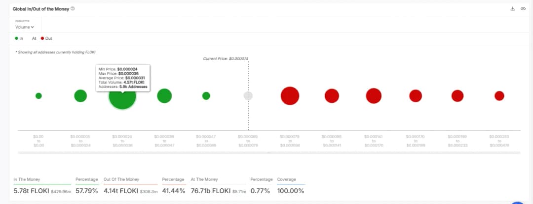 علاوه بر این، دارندگان FLOKI توزیع سودآوری قویای را نشان دادهاند، به طوری که 57.79 درصد از توکنها "در سود" هستند، به این معنی که این دارندگان زیر قیمت فعلی $0.000074 خرید کردهاند. این امر نشان میدهد که اکثر سرمایهگذاران همچنان در سود هستند که فشار فروش را کاهش میدهد.