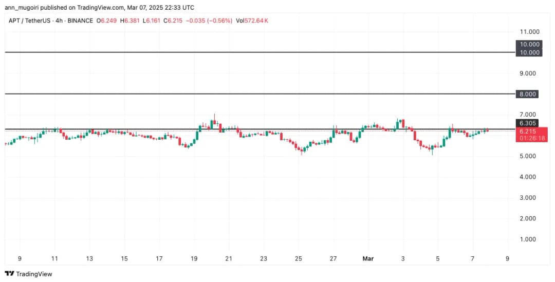 یک فشار صعودی پایدار میتواند APT را در کوتاهمدت به بالای ۱۰ دلار برساند. در حال حاضر، آپتوس با وجود اصلاحات گستردهتر بازار کریپتو، با افزایش ۵.۱۶ درصدی در ۲۴ ساعت گذشته به ۶.۲۷ دلار معامله میشود.