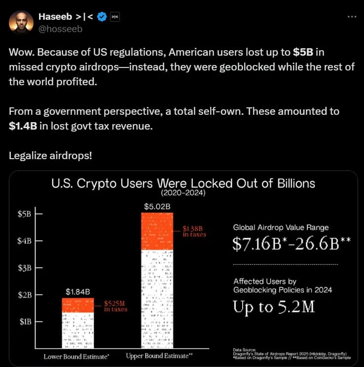 در چهار سال گذشته، میلیونها دارنده کریپتو در ایالات متحده نتوانستهاند در ایردراپهای بزرگ شرکت کنند و حدود ۵ میلیارد دلار از درآمدهای بالقوه را از دست دادهاند. مطالعه اخیر شرکت سرمایهگذاری خطرپذیر Dragonfly نشان داد که سیاستهای مسدودسازی جغرافیایی، که توسط پروژههای کریپتو برای اجتناب از نظارت مقرراتی ایالات متحده اجرا میشود، عامل این زیانها بوده است. این محدودیتها ناشی از عدم قطعیت قانونی در مورد اینکه آیا توکنهای ایردراپ شده به عنوان اوراق بهادار محسوب میشوند یا خیر، هستند. با افزایش اقدامات اجرایی SEC علیه شرکتهای کریپتو، بسیاری از پروژهها رویکرد محتاطانهای در پیش گرفتهاند و کاربران آمریکایی را بهطور کامل مسدود کردهاند. در واقع، گزارش Dragonfly تخمین زده است که تنها در سال ۲۰۲۴، بین ۱.۸۴ میلیون تا ۵.۲ میلیون کاربر فعال آمریکایی تحت تأثیر این محدودیتها قرار گرفتهاند.