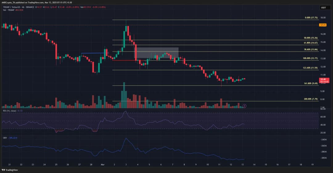 توکن رسمی ترامپ (TRUMP) از سطح مقاومت ۱۳.۸۴ دلار عقبنشینی کرده است. در یک تحلیل هفته گذشته، AMBCrypto اشاره کرد که سطح ۱۴ دلار احتمالاً مانع پیشروی خریداران خواهد شد و قیمت این میمکوین را کاهش خواهد داد. این پیشبینی محقق شده و سطح ۱۱.۵۹ دلار نیز اخیراً به یک مقاومت تبدیل شده است.
