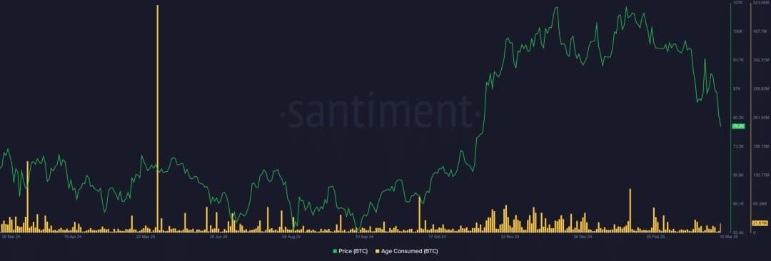 در همین حال، شاخص Age Consumed - که حرکات دارندگان بلندمدت را ردیابی میکند - با وجود سقوط بیت کوین به زیر ۸۰ هزار دلار و از دست دادن میلیاردها دلار از ارزش بازار، افزایش نیافته است.