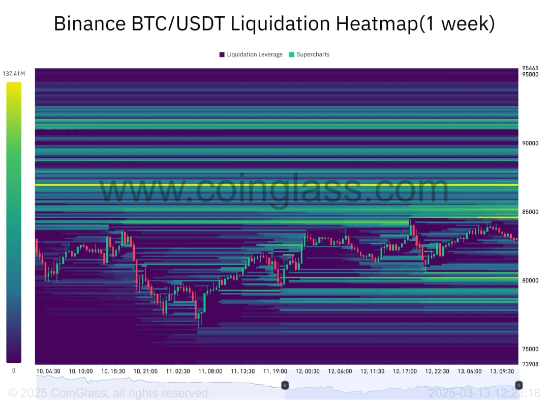 پس از اینکه شاخص قیمت مصرفکننده (CPI) اصلی ایالات متحده در ۱۲ مارس کمتر از حد انتظار و برابر با ۳.۱٪ اعلام شد، ساختار بازار بیت کوین اکنون امکان یک تغییر صعودی سریع را نشان میدهد. پس از سقوط قیمت بیت کوین (BTC) در ۹ مارس، این ارز سه بار به منطقه مقاومت بالای ۸۴ هزار تا ۸۵ هزار دلار بازگشت و باعث شد معاملهگران به طور تهاجمی موقعیتهای فروش کوتاه در این محدوده ایجاد کنند. دادههای نقشه حرارتی تسویه نشان داد که بیش از ۳۰۰ میلیون دلار موقعیت فروش کوتاه در این منطقه قیمتی انباشته شده بود که در صورت حرکت قیمت به بالای مقاومت ۸۵ هزار دلار، تسویه میشدند.