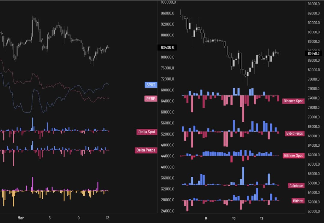 در ۱۲ مارس، اختلاف مشابهی مشاهده شد، به طوری که معاملهگران اسپات بایننس در نزدیکی مقاومت ۸۵ هزار دلار در حال فروش بودند، در حالی که معاملهگران کوینبیس در طول جلسه معاملاتی اولیه ایالات متحده از قیمت ۸۱ هزار دلار دفاع کردند و از کاهش بیشتر جلوگیری کردند. در حالی که کوینبیس در گذشته رهبری رالی بیت کوین را بر عهده داشته است، موضع مخالف بین این دو صرافی پیشرو ممکن است سرعت حرکت بیت کوین را برای عبور سریع از سطوح مقاومت کاهش دهد. بنابراین، برای اینکه بیت کوین در هفتههای آینده به اوجهای بالاتر ۸۵ هزار، ۹۰ هزار و ۹۵ هزار دلار بازگردد، فعالیت معاملاتی اسپات بین این دو صرافی بزرگ ممکن است به جهتگیری جمعی بیشتری نیاز داشته باشد.