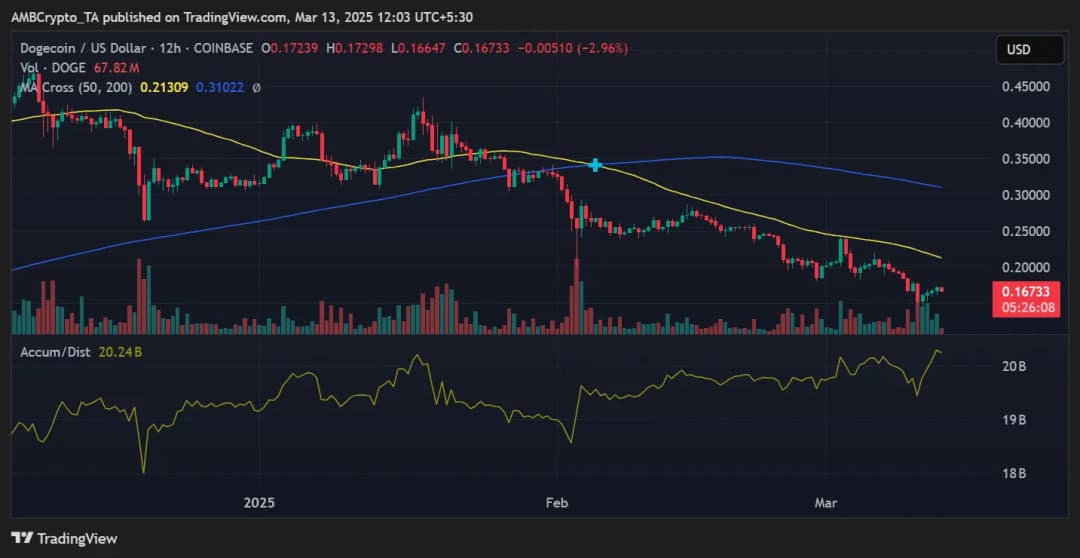 میانگین متحرک ۵۰ روزه و ۲۰۰ روزه بالاتر از قیمت فعلی باقی ماندهاند که نشان میدهد DOGE همچنان در روند نزولی قرار دارد. با این حال، نشانههایی از انباشت وجود دارد، همانطور که شاخص انباشت/توزیع (A/D) نشان میدهد که در زمان نگارش این مقاله در حال افزایش بود.