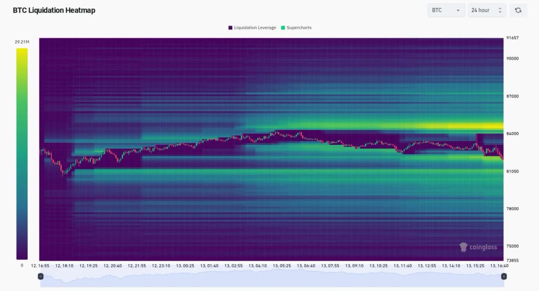 در همین حال، دادههای منبع نظارتی CoinGlass نشان داد که مقاومت کلیدی در مسیر صعودی بلافاصله زیر ۸۵,۰۰۰ دلار متمرکز شده است.