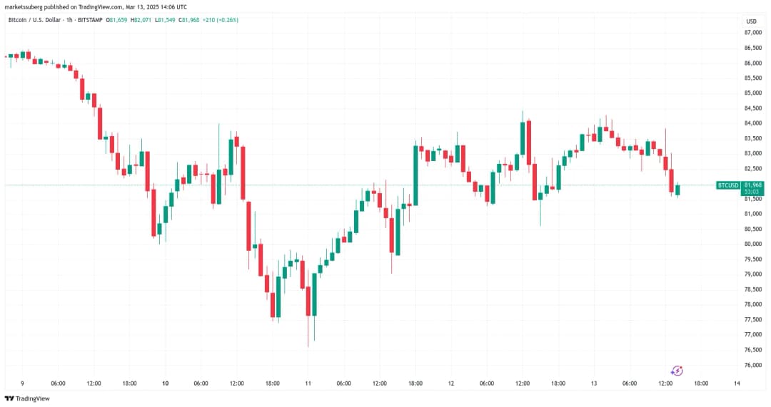دادههای Cointelegraph Markets Pro و TradingView نشان داد که قیمت BTC/USD در محدوده ۸۱,۵۰۰ دلار قرار دارد که ۲.۳٪ کاهش در روز را نشان میدهد.