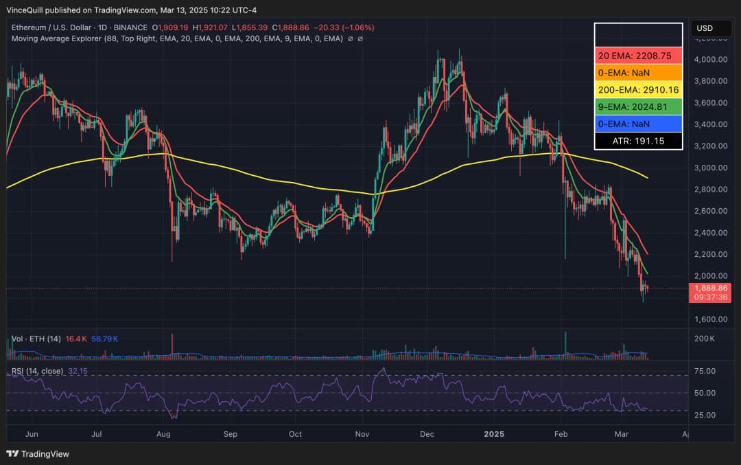 قیمت ETH در هفت روز گذشته بیش از ۱۵ درصد کاهش یافته و از فوریه زیر میانگین متحرک نمایی ۲۰۰ روزه خود معامله شده است. شاخص قدرت نسبی (RSI) در حال حاضر در ۳۱ قرار دارد که تقریباً در منطقه اشباع فروش است و میتواند نشاندهنده یک کف محلی و احتمالاً بازگشت قیمت باشد.