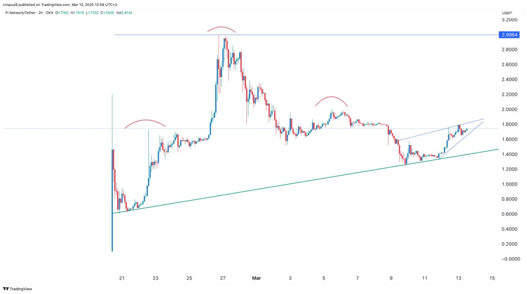 نمودار دو ساعته نشان میدهد که قیمت Pi Network در فوریه حدود ۳ دلار به اوج رسید و سپس عقبنشینی کرد. اکنون کمی بالاتر از خط روند صعودی که پایینترین نوسانات از ۲۳ فوریه را به هم متصل میکند، باقی مانده است. این خط روند احتمالاً خط گردن الگوی سر و شانهها است که یک نشانه نزولی محبوب است.