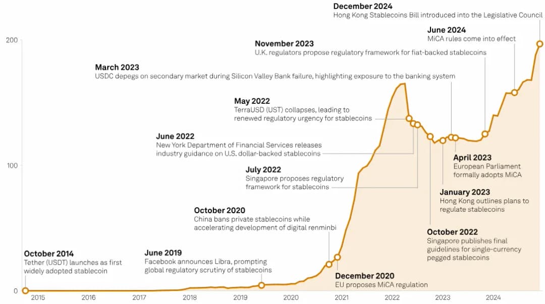 با بیش از ۲۳۰ میلیارد دلار در گردش، استیبل کوینها به یکی از کاربردهای قابلتوجه بلاکچین تبدیل شدهاند. موفقیت این صنعت تا حد زیادی به ادغام استیبل کوینها توسط ارائهدهندگان پرداخت فینتک بزرگ نسبت داده میشود.