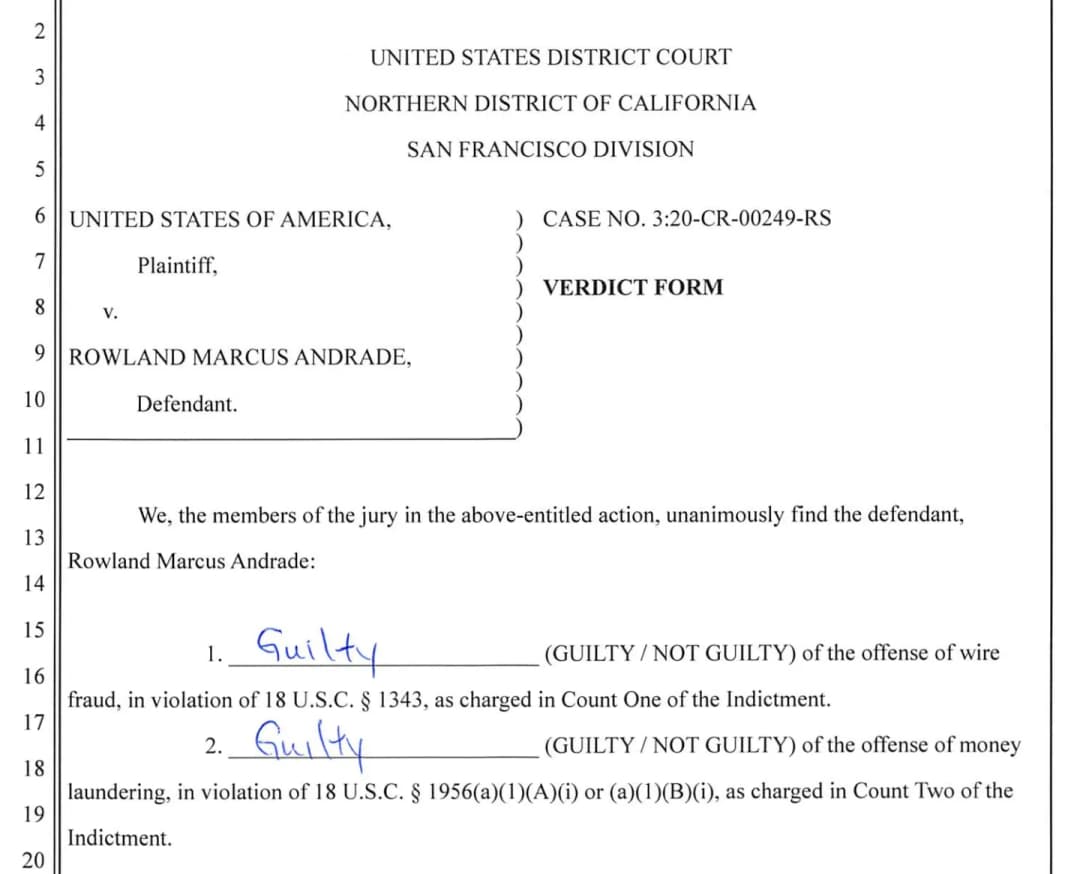 در دادگاه ۱۲ مارس در دادگاه منطقه شمالی کالیفرنیا، هیئت منصفه، رولند مارکوس آندراده، سازنده AML Bitcoin را به دو فقره جرم جنایی در طرحی برای فریب سرمایهگذاران محکوم کرد.