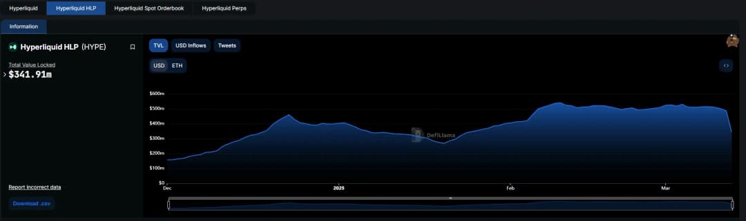 تا ۱۳ مارس، HLP دارای ارزش کل قفل شده (TVL) تقریبی ۳۴۰ میلیون دلار از سپردههای کاربران است. طبق گزارش DefiLlama، صرافی پرپهای شاخص Hyperliquid که در سال ۲۰۲۴ راهاندازی شد، ۷۰٪ از سهم بازار را به خود اختصاص داده و از رقبایی مانند GMX و dYdX پیشی گرفته است.