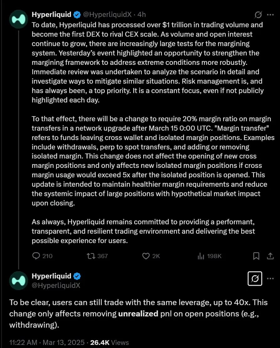 از ۱۵ مارس، Hyperliquid از معاملهگران خواهد خواست که حداقل ۲۰٪ مارجین وثیقه را در برخی از موقعیتهای باز حفظ کنند تا «تأثیر سیستماتیک موقعیتهای بزرگ با تأثیر فرضی بازار در هنگام بسته شدن» را کاهش دهند.