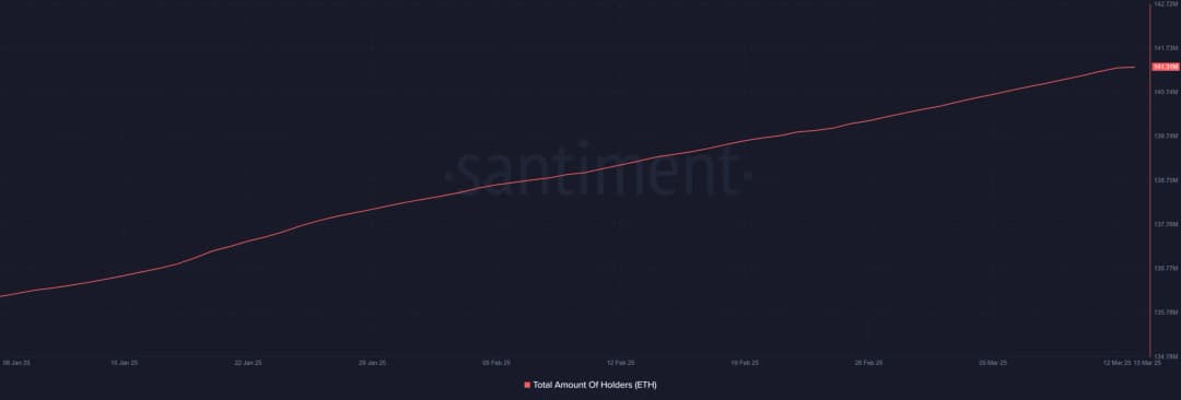 در حالی که قیمت اتریوم در حال تقلا است، تعداد دارندگان آن به طور پیوسته در حال افزایش بوده است. دادههای درون زنجیرهای Santiment نشان میدهد که تعداد کل دارندگان ETH به حدود ۱۴۱.۳۱ میلیون رسیده که نشاندهنده رشد مداوم علیرغم کاهش قیمت است. این امر نشان میدهد که در حالی که معاملهگران کوتاهمدت در حال خروج از موقعیتهای خود هستند، سرمایهگذاران بلندمدت همچنان در انباشت ETH در سطوح فعلی ارزش میبینند.