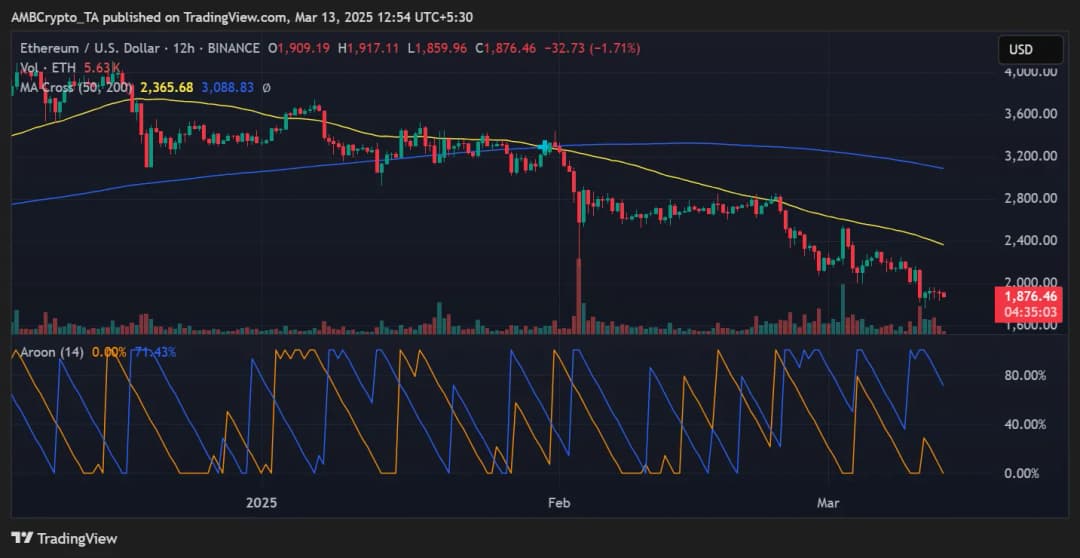 اندیکاتور Aroon که قدرت روند را اندازهگیری میکند، در حال حاضر ضعف را نشان میدهد و حاکی از آن است که ETH همچنان در روند نزولی قرار دارد. با این حال، شکست بالای میانگین متحرک ۵۰ روزه [۲۳۶۵] نشاندهنده بازگشت شتاب صعودی خواهد بود.