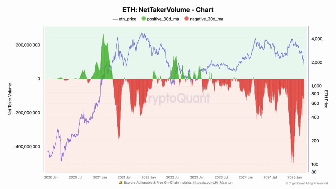 دادههای CryptoQuant نشاندهنده یک مرحله طولانی از فروش تهاجمی بوده و حجم خالص معاملات، مقادیر بسیار منفی را نشان میدهد. این بدان معناست که سفارشات فروش بر سفارشات خرید غالب بوده و ساختار بازار اتریوم را تحت کنترل نزولی قرار داده است. بهطور تاریخی، چنین حجم معاملات منفی طولانی مدتی، قبل از اصلاحات عمده یا رویدادهای تسلیم شدن رخ میدهد که میتواند در صورت تداوم روند، به کاهش بیشتر قیمت منجر شود.