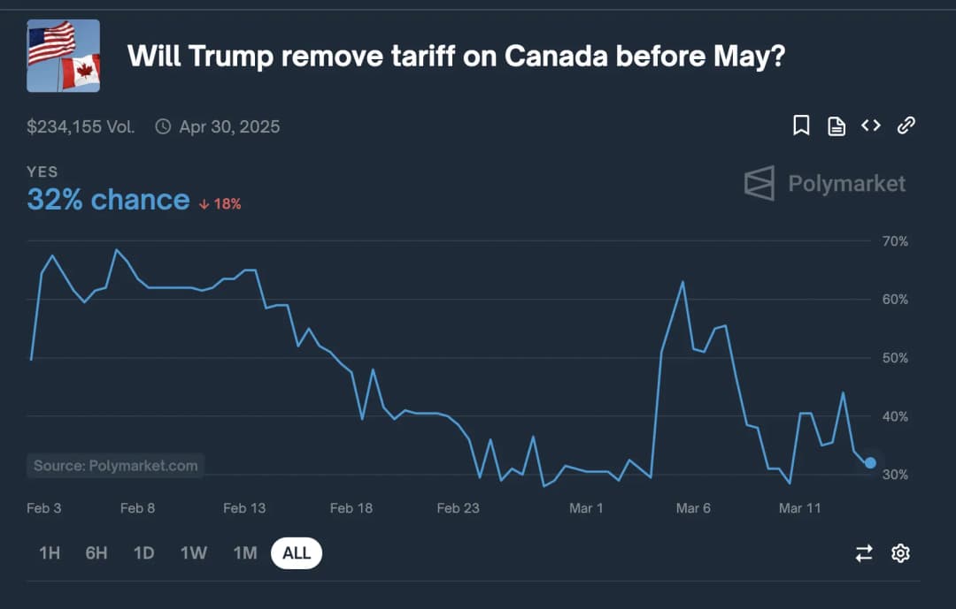 احتمال جنگ تجاری بین ایالات متحده و کانادا ۱۸٪ کاهش یافته است، ۱۳ مارس ۲۰۲۵ | منبع: Polymarket