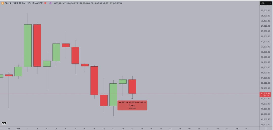 بیت کوین معاملات روز پنجشنبه را با قیمت ۸۳۷۰۰ دلار آغاز کرد اما به سرعت با فشار فروش مواجه شد و ۴٪ کاهش یافت تا در زمان نگارش این خبر، کمی بالاتر از ۸۱۰۰۰ دلار قرار گیرد. سطح ۷۹۰۰۰ دلار در اوایل جلسه آزمایش شد که نشاندهنده تضعیف حمایت است زیرا احساسات بازار همچنان شکننده باقی مانده است.