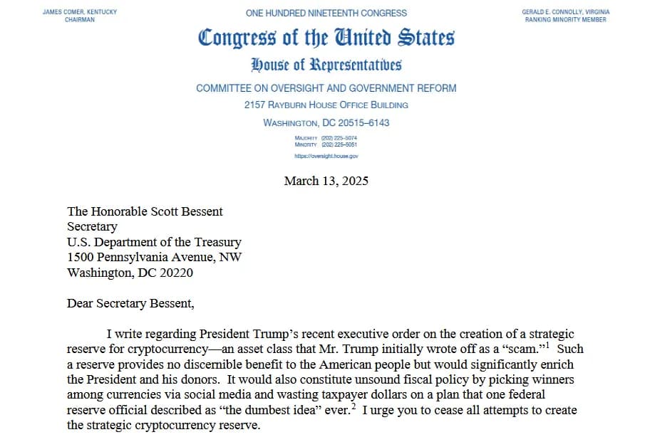 یک نماینده دموکرات از وزارت خزانهداری ایالات متحده خواسته است تا «تمام تلاشها» برای ایجاد یک ذخیره راهبردی کریپتو در ایالات متحده را متوقف کند. او با اشاره به تضاد منافع با دونالد ترامپ، رئیسجمهور ایالات متحده، استدلال کرده که این ذخیره به نفع مردم آمریکا نیست.