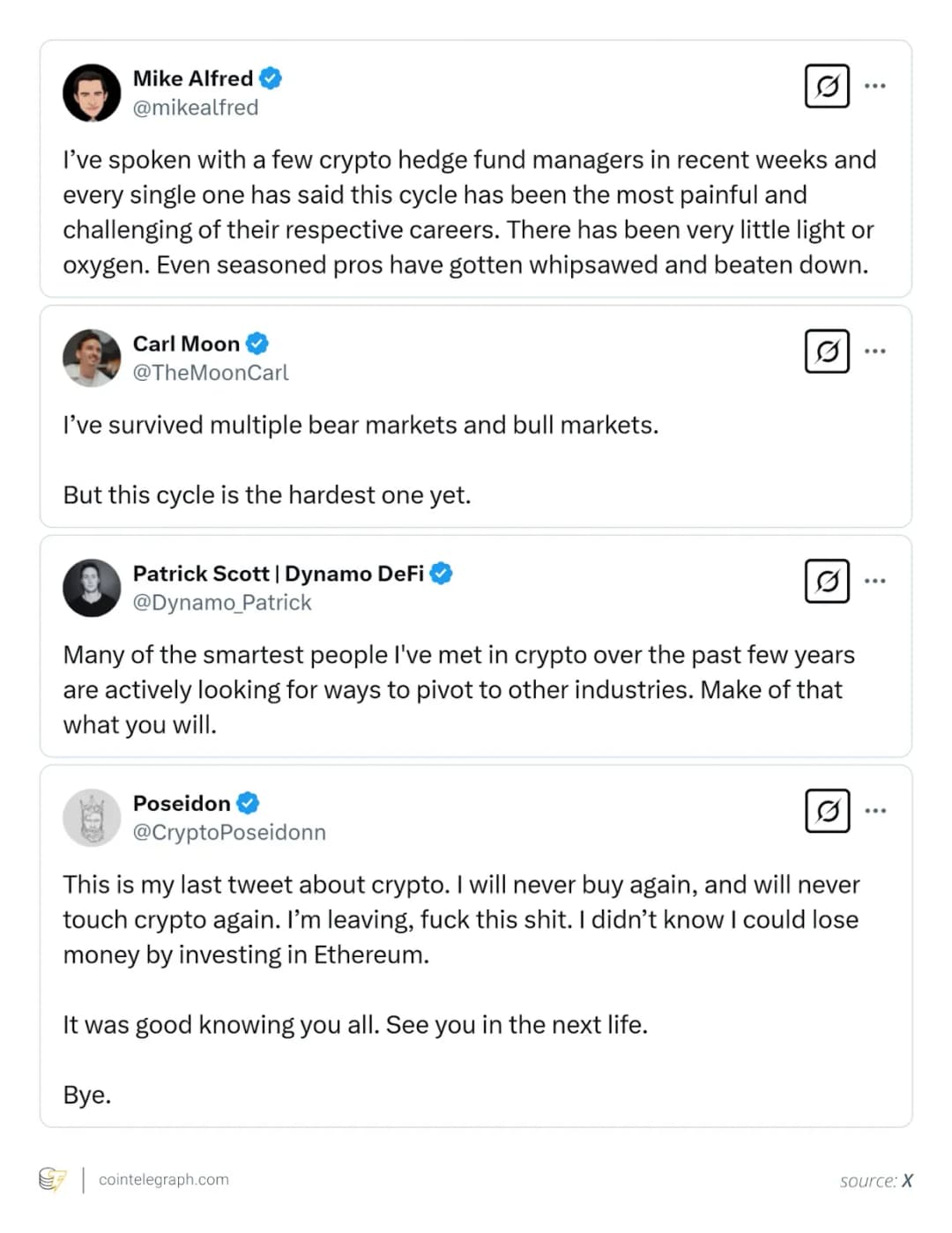 «فروپاشی Mt. Gox ۷۰ درصد از حجم معاملات بیت کوین را از بین برد و منجر به کاهش ۸۵ درصدی در بازاری بدون حمایت نهادی و با نقدینگی بسیار کمتر شد»، بوردون گفت. به گفته برت ریوز، رئیس فروش اروپایی BitGo، در بازار فعلی «بسیار بیشتر از قطعات در حال سقوط» وجود دارد. علاوه بر کاهشهای قیمتی بزرگتر در گذشته، ریوز به پیشرفتهای قابل توجه در محصولات و مقررات جهانی کریپتو اشاره کرد که نشان میدهد داراییهای کریپتو به طور فزایندهای به بخشی جداییناپذیر از سیستم مالی بینالمللی تبدیل میشوند. او گفت: «در حالی که قیمتها ممکن است در حال حاضر در حال سقوط باشند، ما باید به یاد داشته باشیم که در مدت زمان کوتاهی چقدر پیشرفت کردهایم و این فضا در سالهای آینده چقدر پتانسیل دارد.» برخلاف شکاکان و بدبینان کریپتو، برخی از مدیران صنعت حتی چرخه بازار فعلی را یک بازار صعودی میدانند. «من در واقع فکر میکنم این بهترین است»، بنیانگذار Quantum Economics، ماتی گرینسپن، به Cointelegraph گفت و افزود: «آنچه این بازار صعودی را از رونقهای قبلی کریپتو متمایز میکند این است که این اولین باری است که شاهد افزایش قیمتها در طول زمان هستیم که با چاپ پول فراوان همراه نیست. این عقبنشینی یک درد کوتاهمدت است که منجر به سود بلندمدت خواهد شد.» به گفته مایلز دویچر، تحلیلگر کریپتو، اصطلاحاتی مانند «بازار صعودی»، «بازار نزولی»، «چرخه» یا «فصل آلتکوینها» حتی برای وضعیت فعلی بازار مناسب نیستند.