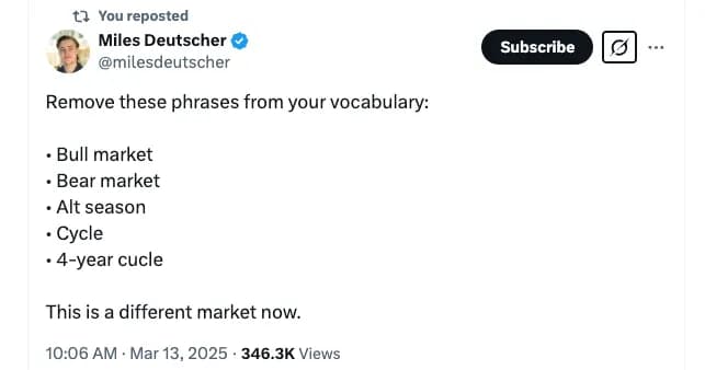 «برای کسانی که چرخههای متعددی را پشت سر گذاشتهاند، این فقط بخشی از فرآیند است»، لوسین بوردون، تحلیلگر Trezor، به Cointelegraph گفت. کاهش فعلی بازارهای کریپتو پس از آن رخ داد که بیت کوین (BTC) در دسامبر ۲۰۲۴ به بالاترین سطح تاریخ خود یعنی بیش از ۱۰۶ هزار دلار رسید که این افزایش عمدتاً به دلیل خوشبینی نسبت به پیروزی دونالد ترامپ در انتخابات ریاست جمهوری ایالات متحده بود. در حالی که بسیاری خوشبین بودند، برخی سرمایهگذاران، مانند آرتور هیز، یکی از بنیانگذاران BitMEX، به درستی پیشبینی کردند که پس از مراسم تحلیف ترامپ در ۲۰ ژانویه، فروش کریپتو رخ خواهد داد.