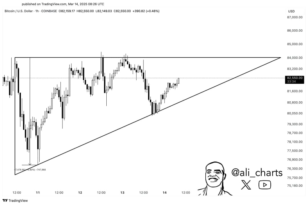 علیرغم این مبارزه، بیت کوین در یک الگوی مثلث صعودی باقی مانده است و تحلیلگران تکنیکال پیشنهاد میکنند که یک شکست میتواند منجر به حرکت قیمتی ۹ درصدی شود.