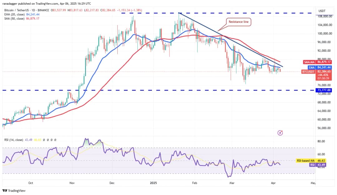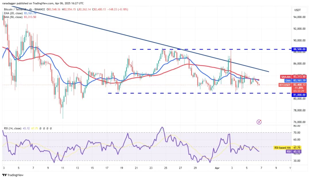 میانگین متحرک نمایی 20 روزه (84,241 دلار) در حال هموار شدن است و شاخص قدرت نسبی (RSI) کمی زیر نقطه وسط قرار دارد که تعادل میان عرضه و تقاضا را نشان میدهد. در صورتی که قیمت با شکست و بسته شدن بالای خط مقاومت جاری حرکت کند، فشار خرید به نفع گاوها تغییر خواهد کرد. در حالی که مقاومت در سطح 89,000 دلار وجود دارد، اگر این سطح از بین برود، جفت ارز BTC/USDT ممکن است به سمت 100,000 دلار حرکت کند. همچنین، سطح 80,000 دلار به عنوان پشتیبانی حیاتی در نظر گرفته میشود؛ در صورت شکستن این سطح، قیمت ممکن است به 76,606 دلار و سپس به 73,777 دلار فرو رود.