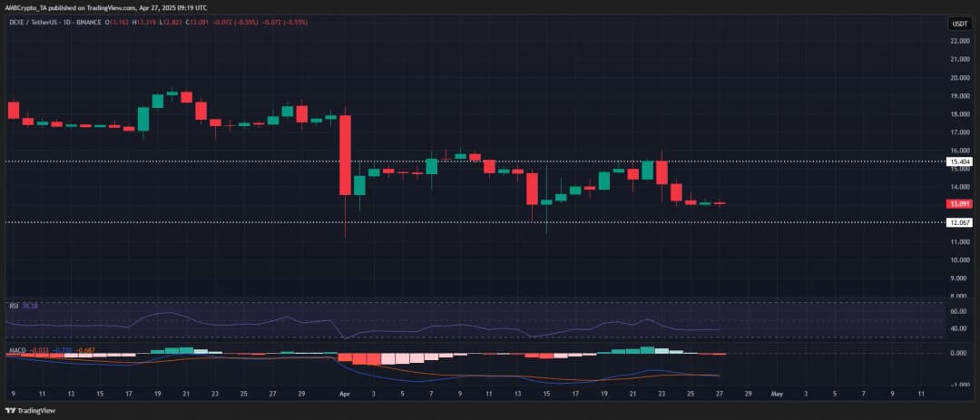 از نظر تاریخی، حمایت ۱۲٫۱۵ دلار تلاش میکند سقوط قیمت را مهار کند. علاوه بر این، با افت ۵۰٪ حجم معاملات، خرسها فرمانروایی میکنند. در نتیجه، آزمایش مجدد این کف بهعنوان گام بعدی پیش از هر بازیابی محتمل است. پس تعجب نکنید اگر DEXE در هفته آینده هم روند نزولی خود را ادامه دهد.