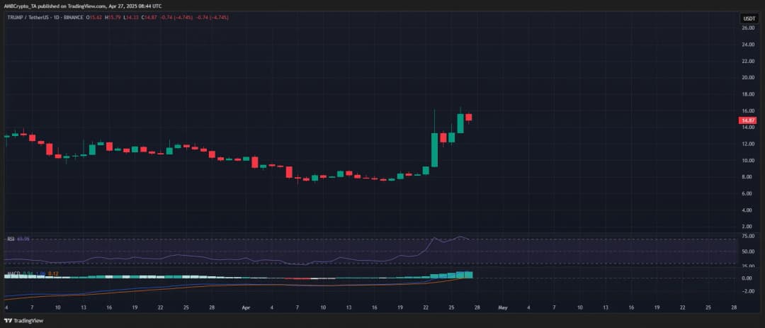 Official Trump [TRUMP] با جهش بیش از ۸۰٪ به سه رمزارز برتر هفته راه یافته است که این اتفاق تصادفی نیست. این رالی بخشی از یک بازی استادانه بهدست خود رئیسجمهور است. کمتر از یک ماه تا برگزاری شامی بینظیر با ترامپ برای ۲۲۰ دارنده برتر این میمکوین باقی مانده و رقابت برای کسب این جایگاهها داغتر از همیشه است. مطمئناً شاخص RSI عددی بالای ۸۰ را نشان میدهد که هشدار اشباع خرید است و MACD هم نشانههایی از روند نزولی دارد؛ اما وقتی ترامپ دخیل است، هر چیزی ممکن است.