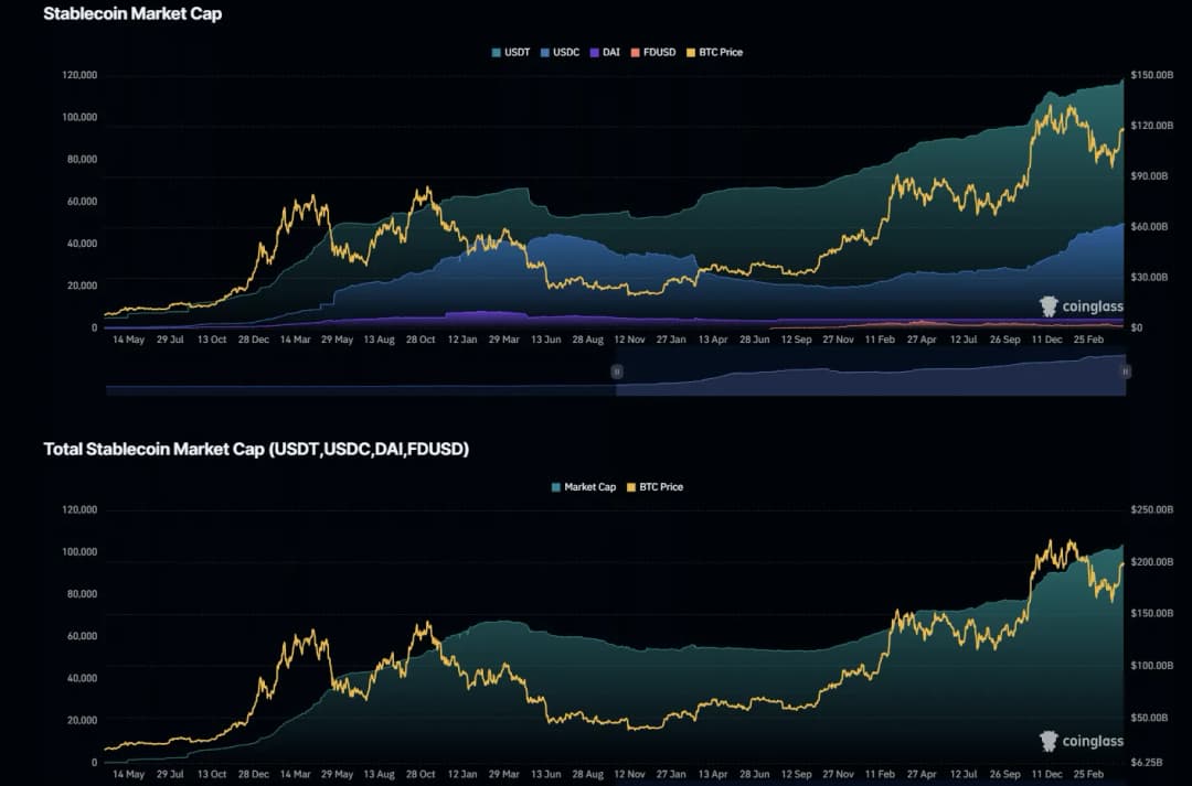 با این حال، بازار USDT از ژانویه تا آوریل ۲۰۲۵ از ۱۳۷ میلیارد دلار به ۱۴۸ میلیارد دلار (+۱۱ میلیارد) افزایش یافت. در همین بازه، USDC از ۴۳ میلیارد دلار به ۶۲ میلیارد دلار (+۲۰ میلیارد) رشد کرد.