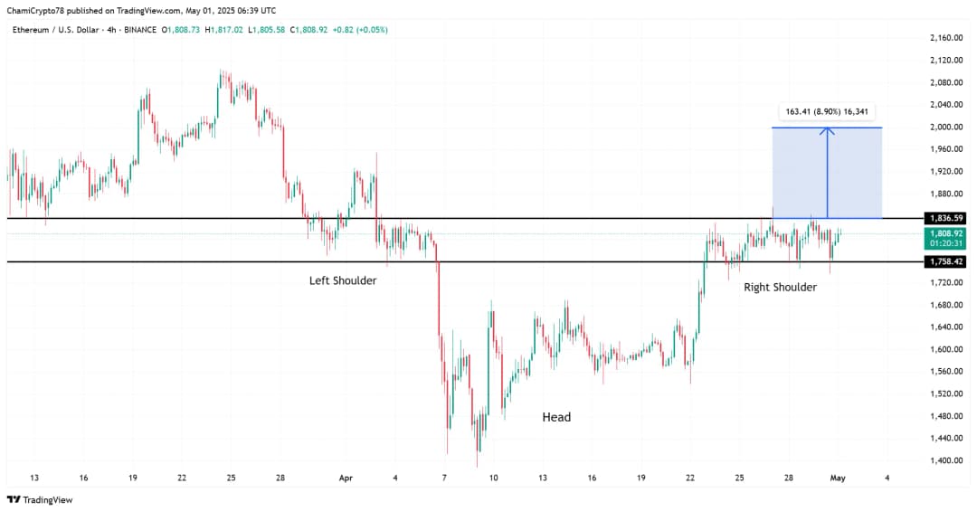 نرخ تامین مالی اتریوم مثبت و برابر با ۰.۰۰۵۴۳٪ است که نشاندهنده احساسات صعودی در بازار است. تعداد موقعیتهای لانگ از شورت پیشی گرفته و اعتماد سرمایهگذاران به حرکت قیمتی ETH را نشان میدهد. علاوه بر این، اتریوم در حال شکلگیری الگوی «سر و شانه» است که حمایت کلیدی در حدود ۱۷۵۸ دلار و مقاومت در محدوده ۱۸۳۶–۱۸۵۰ دلار دارد. شکست این مقاومت میتواند ETH را هدف ۲۰۰۰ دلار قرار دهد و پتانسیل رشد ۸.۹٪ را فراهم کند. روند حجم معاملات نیز در حال افزایش است که احتمال شکستن این محدوده را تقویت میکند.