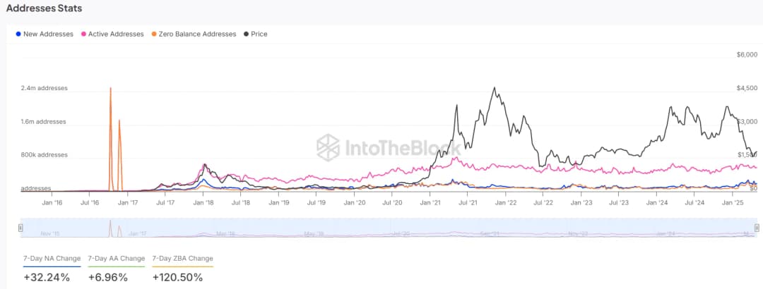 فعالیت شبکه اتریوم روندهای امیدوارکنندهای را نشان میدهد. تعداد آدرسهای جدید در هفت روز گذشته ۳۲.۲۴٪ افزایش یافته که نشانه رشد علاقه سرمایهگذاران است. علاوه بر این، آدرسهای فعال ۶.۹۶٪ افزایش یافته که مشارکت قوی دارندگان فعلی را تایید میکند. آدرسهای با موجودی صفر ۱۲۰.۵۰٪ رشد داشته که نشاندهنده احساسات مثبت خردهفروشی است. هرچند بسیاری از سرمایهگذاران هنوز موقعیتهای قابلتوجهی نگرفتهاند، اما پذیرش اتریوم همچنان در حال گسترش است و افزایش تعداد کاربران فعال از ادامه روند صعودی ETH حمایت میکند.