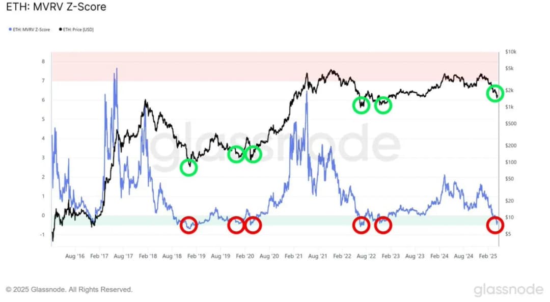 شاخص MVRV Z-Score اتریوم به منطقه بسیار اشباع فروش سقوط کرده است؛ تحرکی که در گذشته باعث شکلگیری کف قیمت این آلتکوین شده بود. با نگاه به روندهای قبلی، هر بار که قیمت ETH وارد این ناحیه میشد، پس از آن جهش قابلتوجهی را تجربه میکرد.