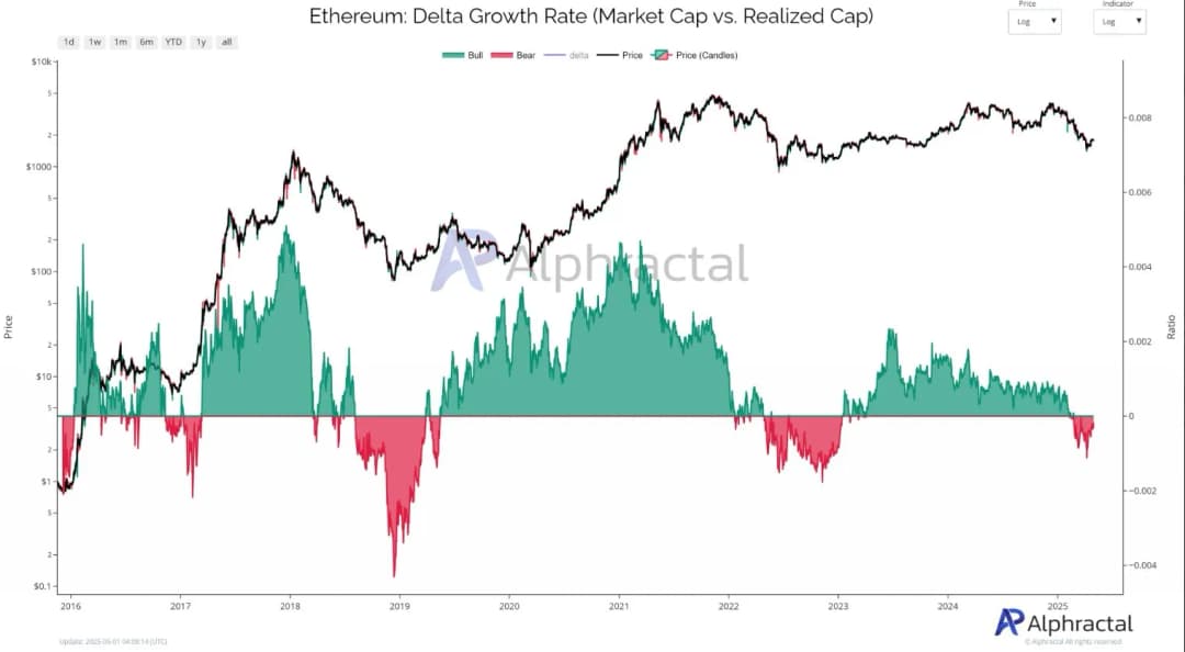 شاخص Delta Growth Rate، که نسبت ارزش بازار ETH به ارزش تحققیافته را میسنجد، نیز وارد قلمرو بازار خرسی شده است. مانند MVRV Z-Score، هرگاه این شاخص منفی میشود، نشان میدهد کف اتریوم شکل گرفته و قیمت میتواند روند صعودی را آغاز کند.