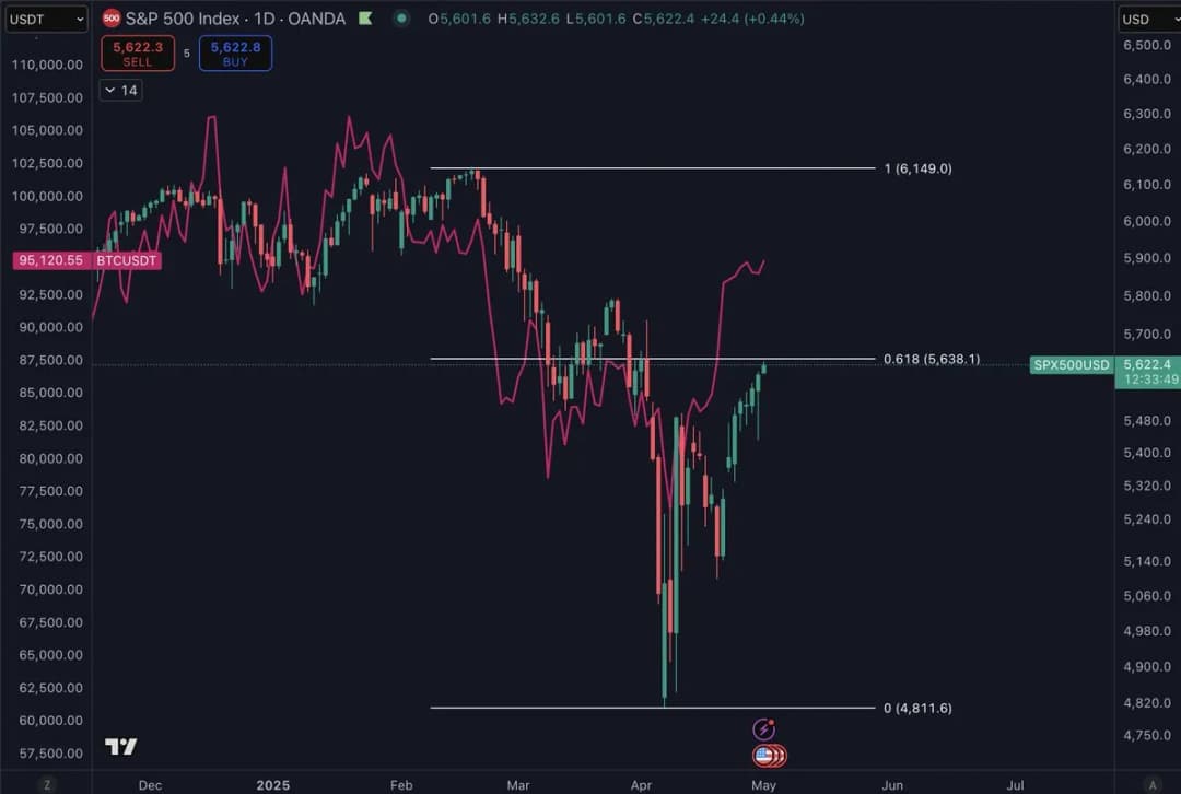 معاملهگر محبوب Daan Crypto Trades در تحلیلهای خود در شبکه X نوشت: «سهام در این نقطه کلیدی معامله میشوند. قانون کلی این است که اگر سهام پس از یک افت بزرگ به بالای سطح اصلاح فیبوناچی ۰.۶۱۸ بازگردد، کف قیمت تثبیت شده است.» نموداری که او منتشر کرد، نشان میداد شاخص S&P 500 به اوج ماهانه نزدیک شده و یک بازیابی Vشکل را رقم زده است.