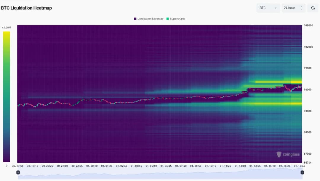 معاملهگر دیگری با نام Skew جریان نقدینگی موجود در دفتر سفارشات صرافیها را دنبال میکرد تا نشانههایی از حرکتهای کوتاهمدت به دست آورد. آخرین دادههای سایت CoinGlass نشان دادند که نقدینگی سفارش فروش در حوالی ۹۷ هزار دلار در حال تجمع است.