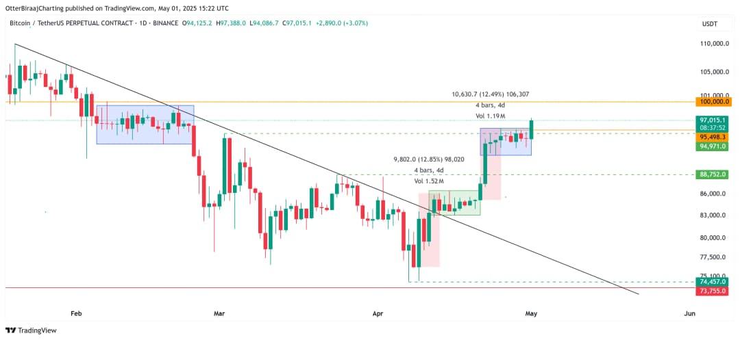 قیمت بیت کوین (BTC) در روز اول مه به بالاترین سطح فصلی خود یعنی ۹۶۷۰۰ دلار رسید؛ یک روز پس از آنکه گزارش تولید ناخالص داخلی آمریکا برای اولینبار از سهماهه دوم ۲۰۲۲ رشد منفی ۰.۳ درصدی را نشان داد. در پی افزایش نگرانیهای اقتصادی، احتمال کاهش نرخ بهره فدرال رزرو در جلسه ۱۸ ژوئن به ۶۲.۸ درصد رسید. طی ۲۴ ساعت گذشته، نقدینگی موقعیتهای شورت بیش از ۱۳۷ میلیون دلار بوده و ژوائو ودسون، مؤسس Alphractal، تأکید کرده است که مومنتوم قیمت بیت کوین همچنان به نفع روند صعودی است.