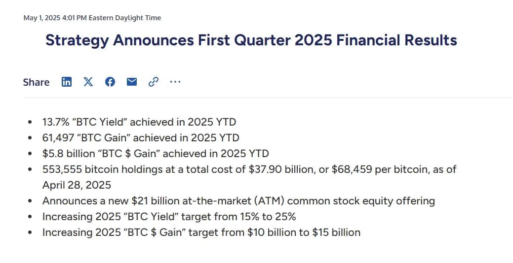 اندرو کانگ، مدیر مالی «استراتژی»، گفت: «ما هدف بازده بیت کوین برای سال 2025 را به 25٪ و هدف سود دلاری بیت کوین را به 15 میلیارد دلار افزایش میدهیم». این شرکت همچنین افزود که در سهماهه اول 2025 بازده 11٪ و سود نزدیک به 50 هزار BTC داشته است.