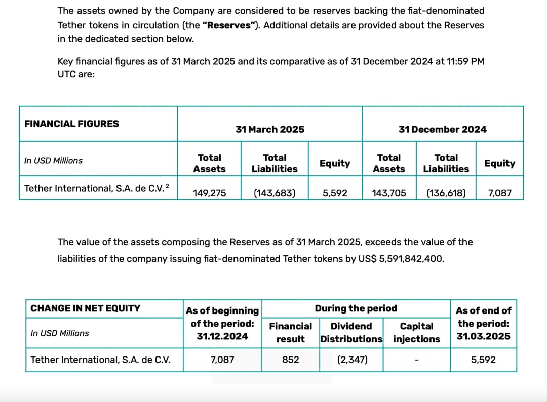 Tether از ۱ میلیارد دلار سود عملیاتی سهماهه اول ۲۰۲۵ و ۵.۶ میلیارد دلار ذخایر مازاد خبر داد