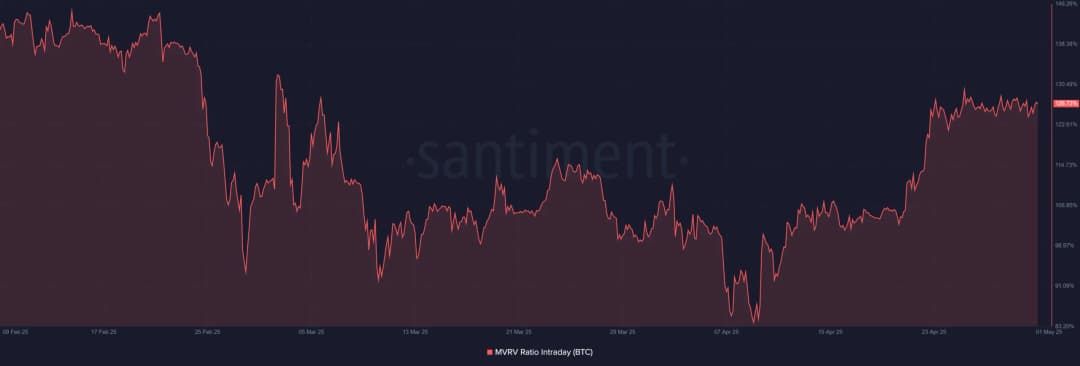 نسبت MVRV بیت کوین تا زمان نگارش به ۱۲۶.۷۳ درصد افزایش یافت، پس از آنکه اوایل آوریل به کف حدود ۸۳ درصد رسیده بود. این بهبود شدید نشان میدهد که اغلب دارندگان بار دیگر در منطقه سود قرار گرفتهاند که معمولاً منجر به فشار فروش میشود. با این حال، سطح فعلی MVRV نسبت به اوجهای تاریخی حبابگونه نیست و نشان میدهد هنوز قبل از رسیدن به مناطق سرخوشی جا برای رشد وجود دارد. بنابراین، گرچه احتیاط لازم است، این جهش سود نباید هنوز به عنوان سیگنال معکوس قریبالوقوع تفسیر شود.