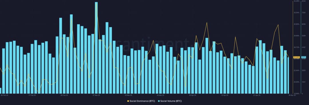 مدلهای ارزیابی آنچین تصویر متفاوتی ارائه میدهند. «عبور طلایی NVT» با افت ۷۵.۰۳- درصدی نشان میدهد که بیت کوین با توجه به فعالیت تراکنشها نسبتاً کمارزش شده است. در همین حال، «مولتیپل پول» روی عدد ۱.۰۸ قرار دارد که با کاهش ۱۱.۸۷- درصدی نشان میدهد استخراج کمی بالا اما نگرانکننده نیست. در مجموع، این سیگنالها تصویری از تعادل ارزیابی ارائه میدهند؛ نه کشیده شده و نه اشباع، اما هنوز فضای صعودی وجود دارد. علاوه بر این، احساسات اجتماعی نیز افزایش یافته است. تا زمان نگارش، سلطه اجتماعی به ۲۵.۰۴ درصد و حجم اجتماعی به ۳,۲۷۴ رسیده است که نشان از بازگشت علاقه خردهفروشی دارد. این جهشها پس از مقاومت BTC در نزدیکی سطوح کلیدی رخ داده و نشانه توجه بیشتر بازار است. گرچه هنوز به سطح هیجانی نرسیده، افزایش گفتگوهای جامعه اغلب با نوسان بیشتر همراه است. بنابراین، اگر علاقه همچنان افزایش یابد، میتواند به عنوان کاتالیزور ثانویه حرکت صعودی عمل کند.