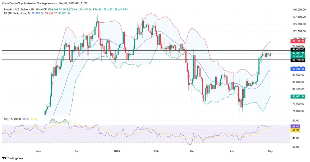 از نظر تکنیکال، BTC درست زیر ۹۶,۰۰۰ دلار نوسان میکند و RSI در سطح ۶۶.۶۰ قرار دارد و وارد محدوده اشباع خرید میشود. باندهای بولینگر الگوی فشردگی نشان میدهند که نوسان قریبالوقوع است. حمایتهای کلیدی در حدود ۹۲.۷ و ۸۹.۵ هزار دلار قرار دارند و مقاومت بعدی ۹۹ هزار دلار است. ساختار فشرده قیمت نشان میدهد که شکست به بالا یا پایین نزدیک است. از این رو، یک بسته شدن قاطع بالای ۹۶ هزار دلار میتواند موج صعودی تا ۱۰۰ هزار دلار را شروع کند، در حالی که رد شدن از این سطح ممکن است به ادامه تثبیت منجر شود.