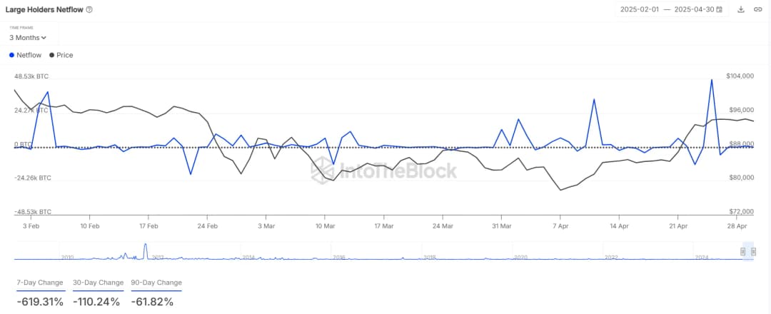تا زمان نگارش این گزارش، بیت کوین (BTC) همچنان در محدوده جانبی معامله میشد و درست زیر مقاومت کلیدی ۹۶,000 دلار قرار داشت. قیمت بیت کوین ۹۵,167.74 دلار بود که با رشد ۰.۴۵ درصدی در روز همراه بود. در واقع، دارندگان بزرگ به نظر میرسد روند توزیع خود را کند کردهاند. جریان خالص ۷ روزه با افت ۶۱۹.۳۱- درصدی مواجه شد و تغییرات ۳۰ روزه و ۹۰ روزه بهترتیب ۱۱۰.۲۴- و ۶۱.۸۲- درصد بودند. این کاهش شدید در خروج سرمایه نشاندهنده تغییر احتمالی رفتار نهنگها از فروش به نگهداری یا انباشت است. علاوه بر این، زمانبندی این کاهش همزمان با خنک شدن فعالیت دارندگان بلندمدت است. بنابراین، افت جریانهای خالص روایت فشار فروش کمتر و ثبات عرضه بیشتر را تقویت میکند.