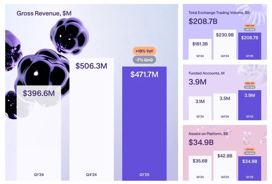 درآمد ۴۷۱.۷ میلیون دلاری Kraken در فصل اول رشدی ۱۹٪ نسبت به فصل مشابه سال قبل داشت، اما نسبت به فصل چهارم ۲۰۲۴ افت ۶.۸٪ را نشان میدهد. حجم معاملات صرافی در این دوره با ۹.۶٪ کاهش به ۲۰۸.۷ میلیارد دلار و ارزش داراییهای نگهداریشده با ۱۸٪ کاهش به ۳۴.۹ میلیارد دلار رسید.